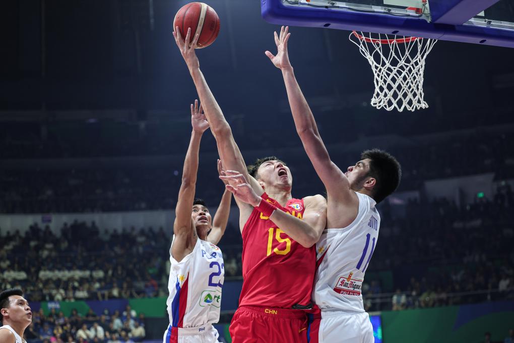 9月2日,中国队球员周琦(中)在比赛中投篮。当日,在菲律宾马尼拉进行的2023年篮球世界杯17-32名排位赛中,中国队以75:96不敌菲律宾队。新华社记者 吴壮 摄