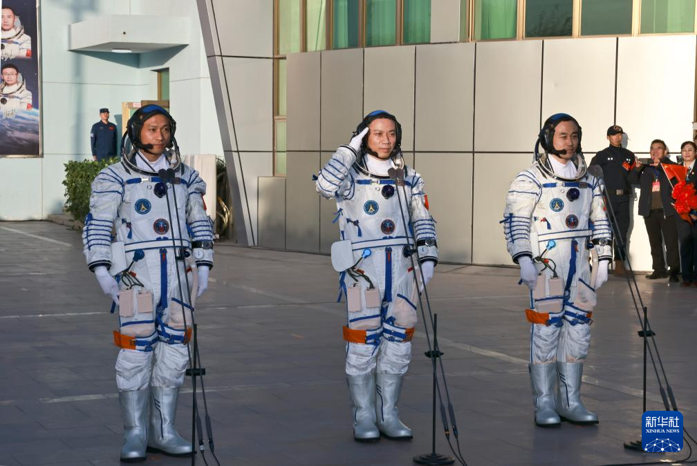 10月26日上午,神舟十七号载人飞行任务航天员乘组出征仪式在酒泉卫星发射中心问天阁圆梦园广场举行。这是航天员汤洪波(中)、唐胜杰(右)、江新林在出征仪式上。