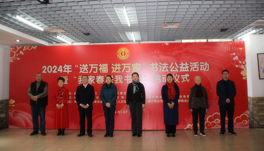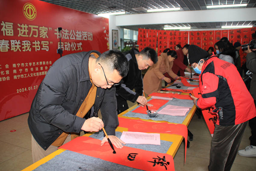 广西南宁讯(张春梅)在新春佳节即将来临之际,为大力弘扬中华优秀传统文化,丰富南宁市广大市民、职工群众、少年儿童的精神文化生活,1月27日,由南宁市总工会、南宁市文学艺术界联合会主办的2024 年“送万福、进万家”书法公益活动暨“我家春联我书写”启动仪式在南宁市工人文化宫隆重开启。
