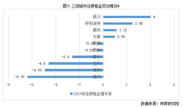 三线城市住房租金涨跌接近参半。住房大数据监测的重点40城中包括10个三线城市,其中4个城市2023年住房租金小幅上涨,6个城市下降。其中,银川和呼和浩特涨幅最高,分别为4%和2.48%;惠州、常州和兰州住房租金跌幅较高,分别为6.39%、4.93%和4.6%。