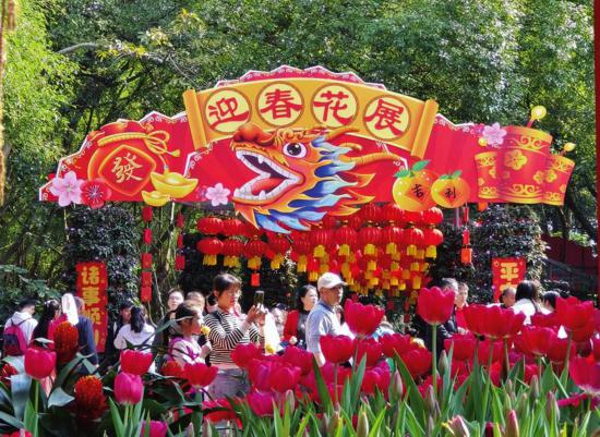 声声锣鼓迎新春。从大年初一开始,南宁园博园景区就展开热闹的舞龙舞狮巡游,向游客传递新春祝福,游客争相摸龙头讨个好彩头。同时,景区推出新春免门票福利,如生肖属龙的游客可免门票入园等。