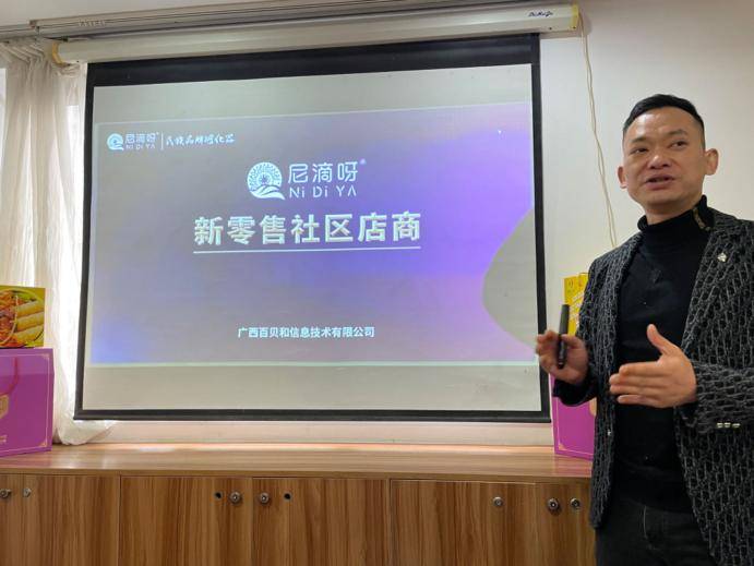黄章恒董事长接着充满激情地说道:“刚才大家唱的歌,是广西‘壮族三月三’的主题曲《广西尼的呀》,‘广西尼的呀’壮语的意思是广西您好!我们公司致力于发展‘线上电商+线下店商’运营模式,创新打造乡村振兴、品牌孵化,助力“桂品出乡、南货北进”。不断地发展民族电商品牌,致力于推动全人类健康生活方式和商业的全面变革,秉承‘利他、感恩、分享、共赢’的理念。广西百贝和信息技术有限公司成立于2016年4月13日。是一家集计算机软硬件技术开发、网络运营、互联网服务、社交电商于一体的信息技术公司。公司旗下社交电商平台‘尼滴呀’致力打造极具壮乡特色的民族品牌孵化器!‘尼滴呀’凭借这一点,与世界有了不一样的联系!”