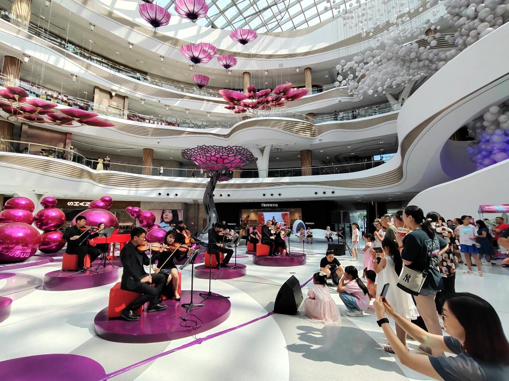 端午假期,海口国际免税城内,伴随着悠扬的音乐,阳光倾泻“天际秘林”梦幻舞台,正在购物的游客们纷纷驻足欣赏。“一场室内音乐会,给购物消费增添了新意和氛围感。”海口市民陈蕾沉浸在阳光和音乐中。