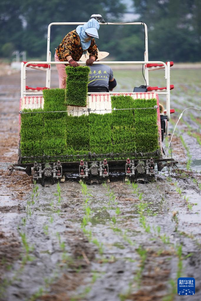 5月30日,在浙江省湖州市吴兴区东林镇保国村,农民驾驶插秧机在田里插秧。