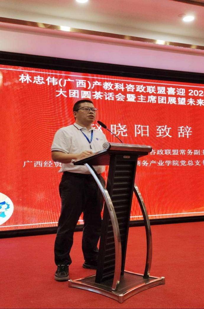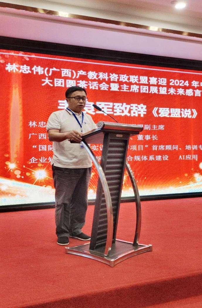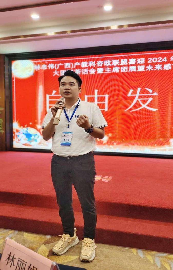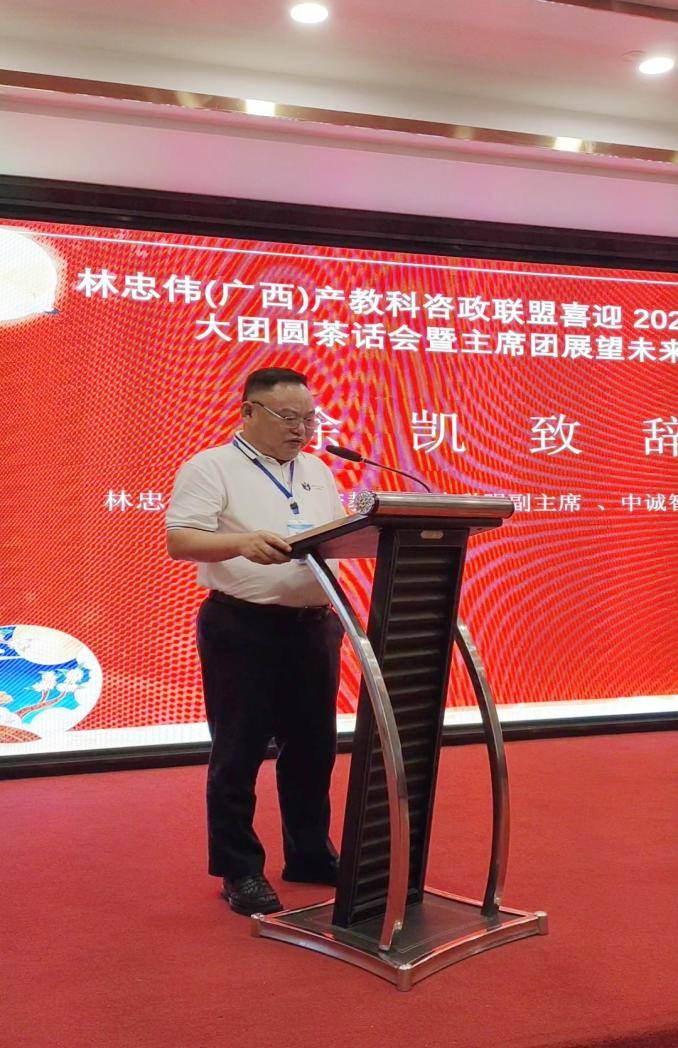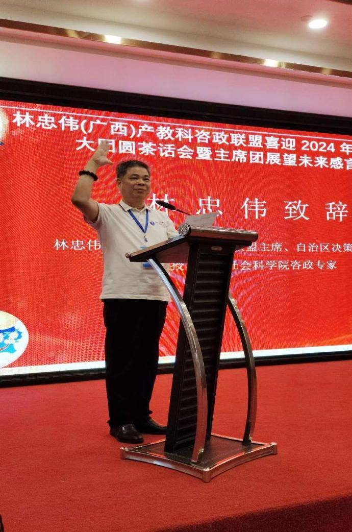 紧接着,林忠伟(广西)产教科咨政联盟主席,致公党中央参政议政工作先进个人,自治区决策咨询专家、教授,致公党中央第十五届农业农村委员,广西中盟文化经济研究院院长,广西社会科学院咨政专家,致公党、民革广西区委参政议政专家,青秀区政协智库首席专家林忠伟上台发表感言:“首先感谢超群常委和德高望重的万老师一直以来对我们咨政联盟的大力支持,感谢在座的顾问团和嘉宾的全力支持,才有我们今天的发展成就,谢谢你们!感谢本次活动的赞助企业,你们的爱盟护盟扶盟的精神令人增强信心,感谢本次活动付出辛劳的全体会务人员,你们的无私奉献令人感动,感谢你们!