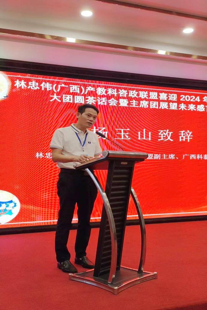 咨政联盟副主席、广西科泰集团总裁杨玉山发言:“在这中秋佳节来临之际,我们欢聚一堂,共庆团圆,同时展望未来,畅谈发展。在此,我谨代表广西科泰科技信息咨询有限公司,向在座的各位致以最诚挚的节日问候,对联盟的邀请表示衷心的感谢。广西科泰咨询是科技厅“技术转移示范机构”、工信厅“中小企业示范平台”,一直为全区各类科技型企业的知识产权、高企认定、小巨人认定等提供咨询服务。在诸位领导、联盟、广大合作伙伴的大力支持下,取得了一些成就。再次感谢联盟对科泰的认可和支持。展望未来,我们科泰公司将继续秉承“开放、共享”的发展理念,加强与联盟成员的交流与合作,共同推动行业的进步与繁荣。借此机会,期待与各位联盟顾问组的各位领导、成员加强交流,资源共享、优势互补,互利共赢。我们坚信,通过我们的共同努力,一定能够开创企业发展的新局面,为联盟作出更大贡献。
