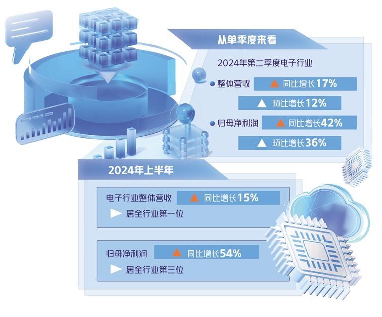 上市公司半年报披露完毕,半导体、电子元件、消费电子、光学光电子等电子行业上半年“成绩单”正式出炉。受益于行业景气度回暖等因素,电子行业半年度业绩提升明显。Wind数据显示,2024年上半年,电子行业整体营收同比增长15%,居全行业第一位;归母净利润同比增长54%,居全行业第三位。从单季度来看,2024年第二季度电子行业整体营收同比增长17%,环比增长12%;归母净利润同比增长42%,环比增长36%。业内分析师认为,目前电子行业去库存和供给侧出清较为充分,在AI算力需求的边际拉动下、在新一轮终端AI化的创新预期中,电子行业将迎来新发展周期。