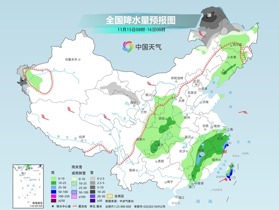 具体来看,今天内蒙古东部、黑龙江西部、新疆南疆西部山区、甘肃祁连山山区等地部分地区有小雪或雨夹雪,其中,内蒙古东北部、黑龙江西北部、新疆南疆西部山区等地部分地区有中到大雪,局地暴雪。陕西南部、重庆西部、江西东部和南部、浙江中南部、广东西北部、台湾岛东部和南部等地部分地区有中到大雨,其中,浙江中南部沿海、台湾岛东部和南部等地局部地区有暴雨或大暴雨。