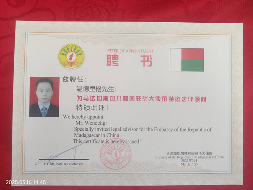 2025年3月,温德里格律师再次站在了国际舞台的聚光灯下。他不仅荣获阿根廷驻华大使馆的表彰,还被马达加斯加驻华大使馆正式聘任为特邀法律顾问。这位在法学界享有盛誉的律师,以其卓越的专业素养和广泛的国际视野,成为了中马友好关系深化的又一重要纽带。