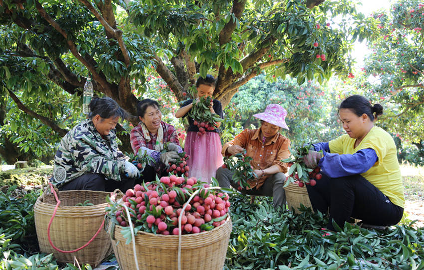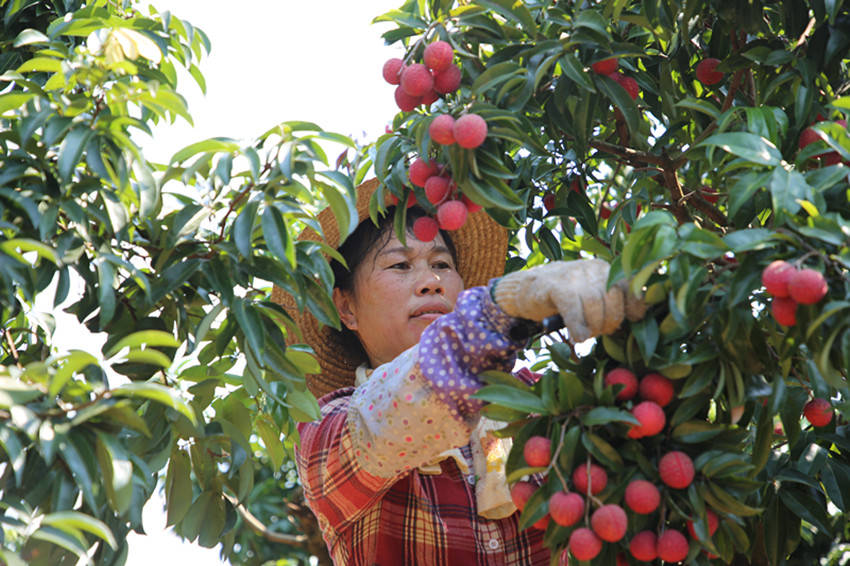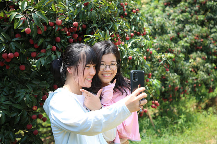 游客在苍梧县沙头镇横江村荔枝园体验摘果乐。(资料图 廖伟 摄)