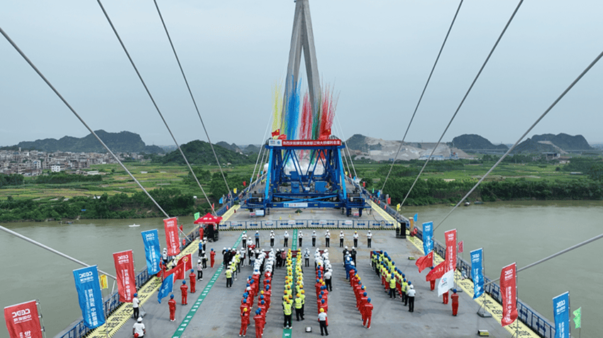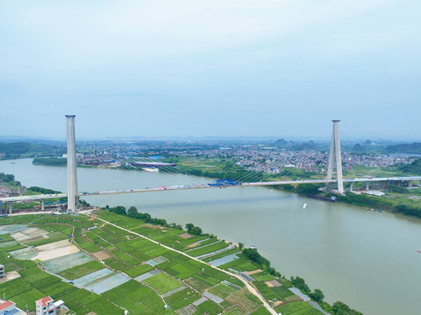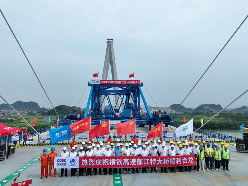 据介绍,横钦高速公路项目由中国能建葛洲坝集团投资建设、葛洲坝交投公司组建项目公司进行管理、葛洲坝一公司承建。该项目起于南宁横州市,终于钦州市钦州港,全长166.024千米,是《广西实施国家战略高速公路网规划(2018-2030)》布局方案中“纵5”的重要组成部分,也是西部陆海新通道中高速公路网主通道。其关键控制性工程——郁江特大桥主桥全长980米,主跨580米,索塔高169米,相当于50层楼高,自重近8万吨,为双塔混合梁斜拉桥。桥梁总长2200米,是广西首座无配重毫米级合龙大跨径斜拉桥,也是广西目前在建第二大跨径斜拉桥。
