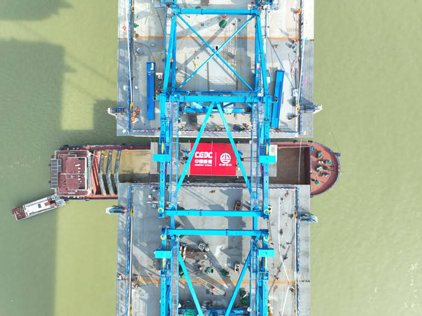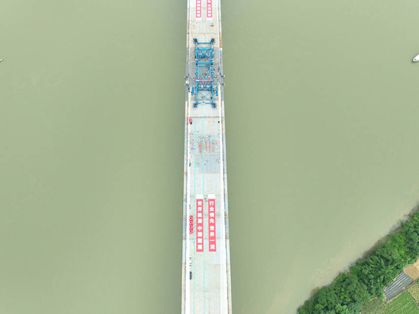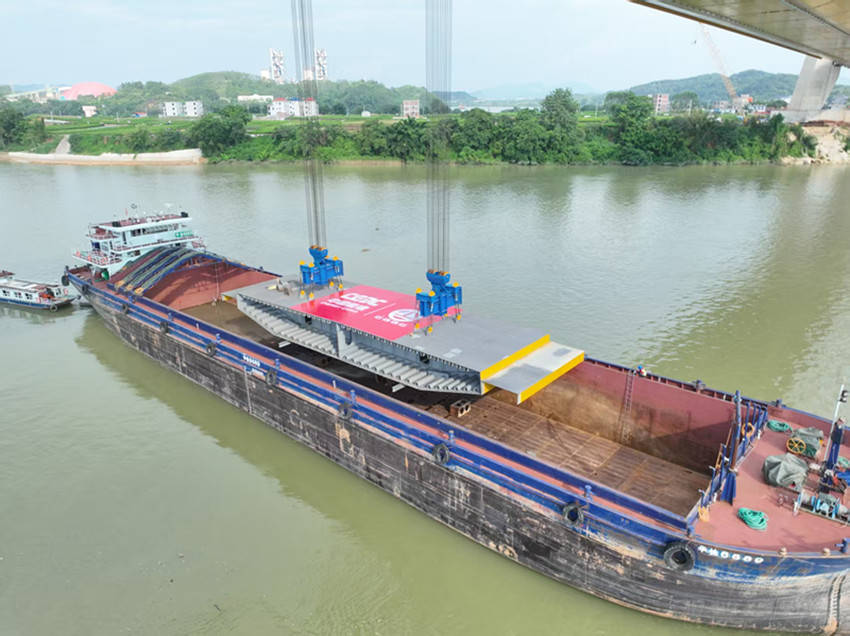 从百米高空“穿针引线”,将所有梁段进行高质量“缝合”,才能将合龙精度牢牢锁定在毫米级。项目团队集提升系统、集中远程监控系统、安全警报系统、自行走系统于一体,将百吨重的钢箱梁节段,像“拼接积木”一样精准安全吊装到位,对吊装全过程实现毫米级掌控。同时通过模拟起吊48小时连续监测,精准进行合龙段主梁配切,匹配最佳合龙口姿态,有效消除单端起吊合龙口高差,确保合龙内力、线形符合设计成桥状态。