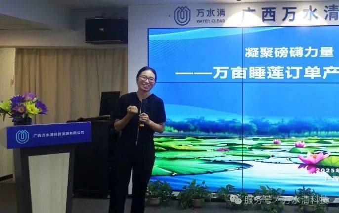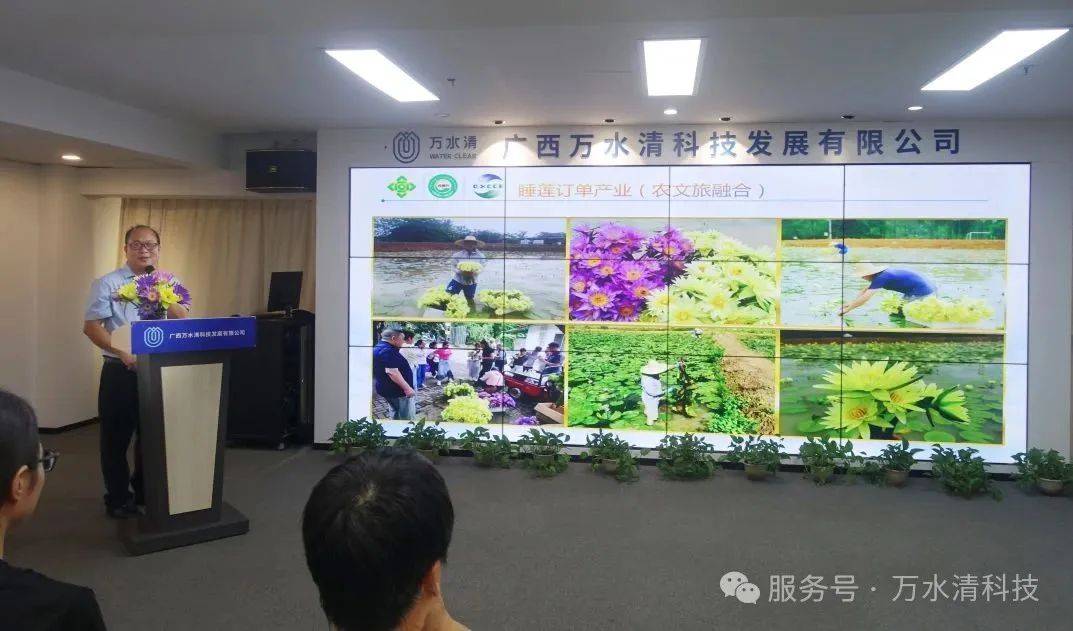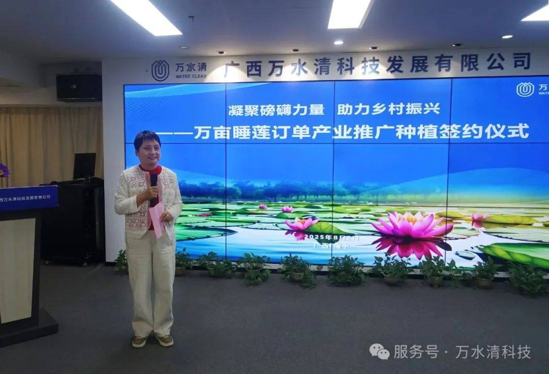 广西万水清科技发展有限公司董事长韦力清在仪式上表示,万水清科技创新性构建了 “治理 + 生产” 资源化利用模式,成为项目的鲜明亮点。该模式将农村水环境治理技术与睡莲种植有机结合,通过生态净化技术改善种植区水质,形成 “水体治理 — 绿色种植 — 品质提升” 的良性循环。这种模式不仅保障了睡莲产品的天然品质,更降低了产业对生态环境的影响,为乡村产业绿色发展提供了可复制“广西方案”。