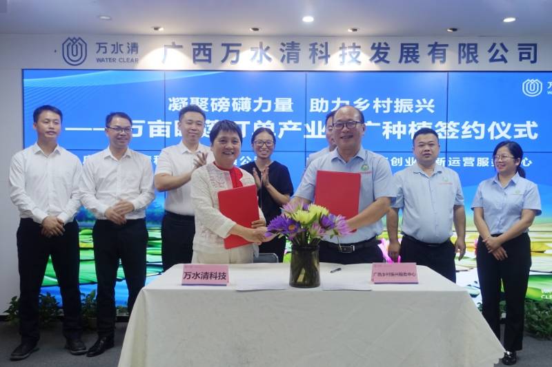 图为: 广西万水清科技发展有限公司董事长韦力清与广西乡村振兴创业创新服务中心李瑞忠主任签约