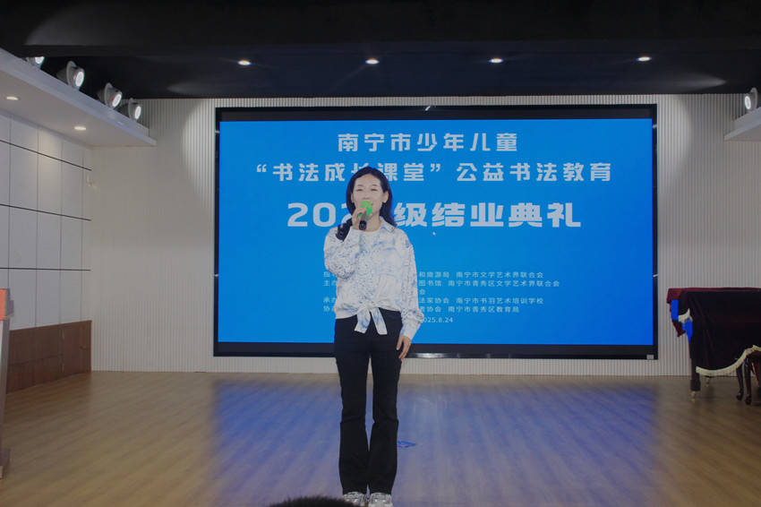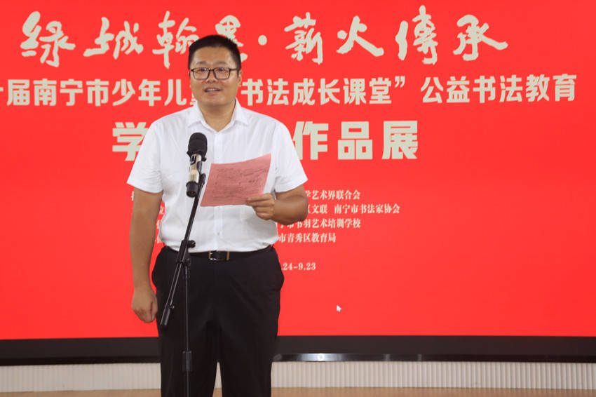南宁市文联党组成员雷鸣在致辞中说到:“书法成长课堂”自2015年创办以来,已走过了十个年头,见证了无数少年儿童的书法梦想从萌芽到绽放的历程,也见证了孩子们在文化素养、审美情趣和人格品质等方面的显著提升。南宁市文联、南宁市书法家协会一直致力于书法艺术的普及与推广,通过“书法成长课堂”等活动,将书法艺术的种子深深播撒在孩子们的心田。希望希望各部门、社会各界继续关心支持少儿书法公益事业,一是不忘初心,牢记使命;二是持之以恒,坚持不懈。三是继承发扬,薪火相传。