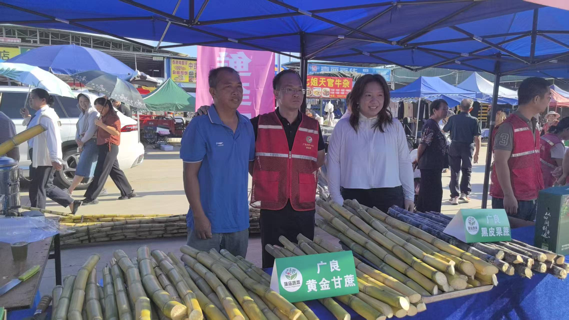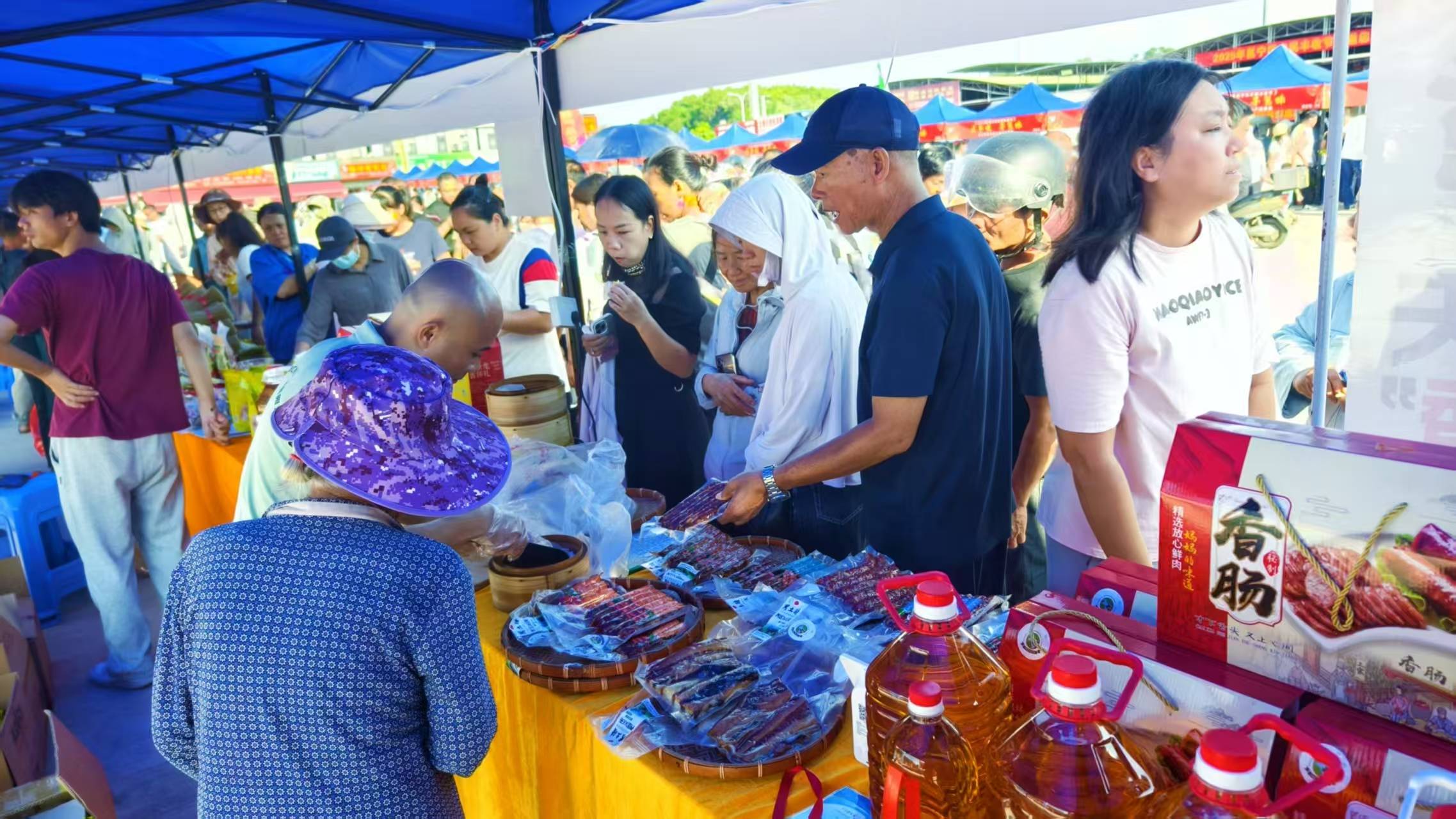丰收的果实摆满了邕宁土货市场,百香果、红心番石榴、甜瓜、甘蔗、小青瓜、澳洲坚果等现场展示试吃,尝过的农民朋友纷纷点赞,并争相购买。淮山干粉、土猪肠、生榨粉等免费试吃,更有柠檬捞鸭、白切鸡等硬菜展示、品尝,真的是用一根牙签可以从第一摊品尝到最后一摊。