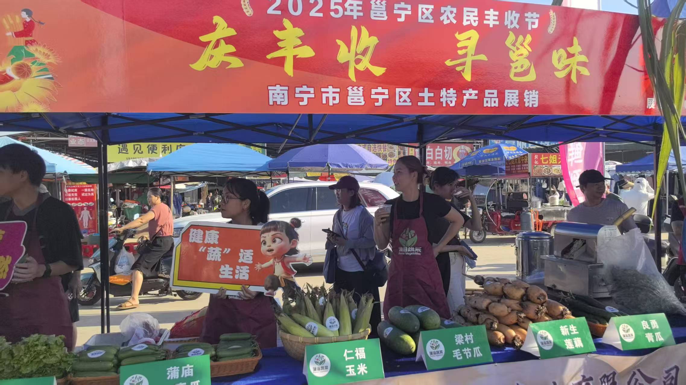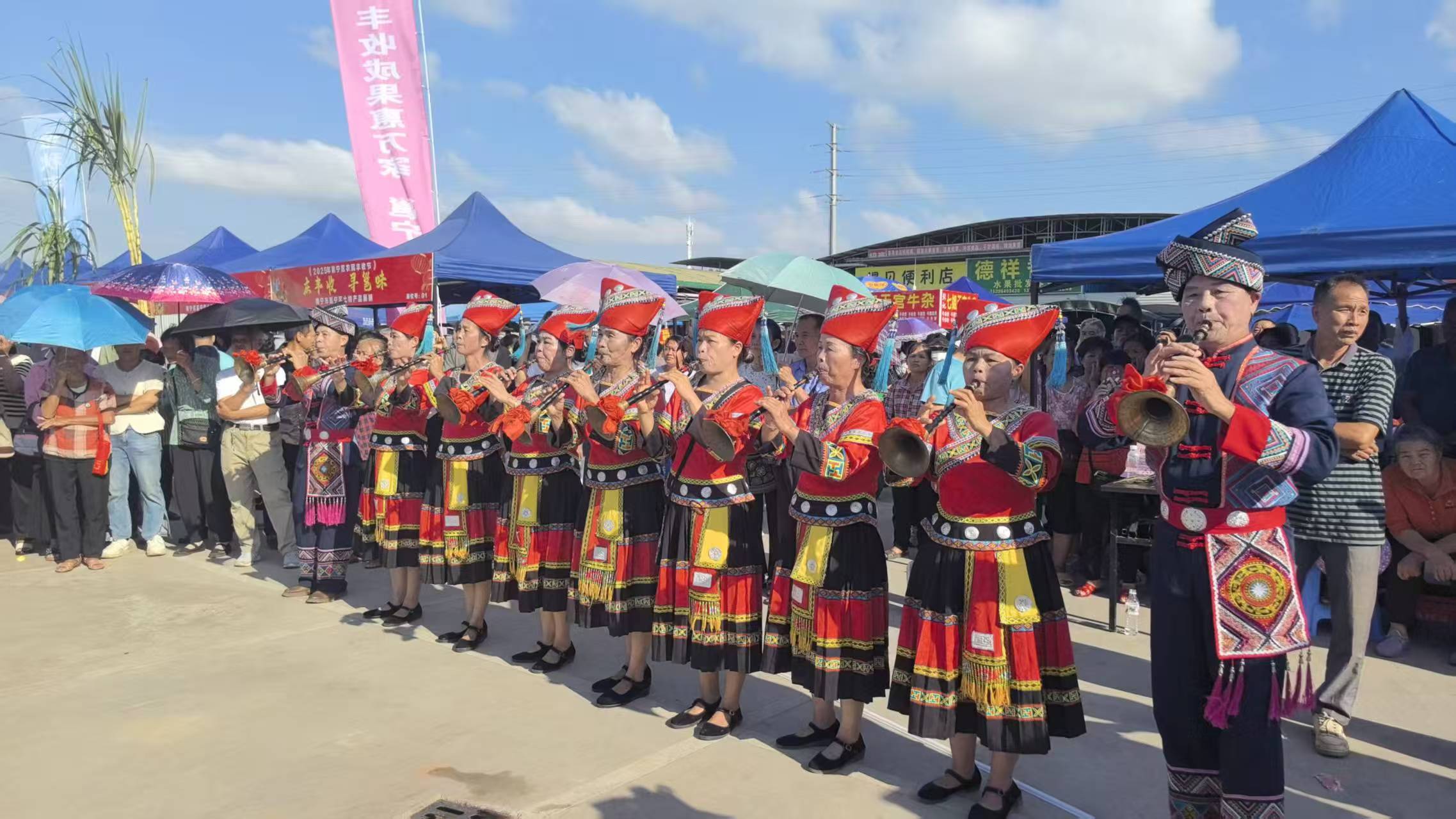 活动由邕宁区土货市场主办,并得到了邕宁区农业农村局、邕宁区蒲庙镇、新江镇、那楼镇、百济镇、中和镇的大力支持。市场内气氛热烈而喜庆,舞台节目丰富多彩。“农产品服装秀”特别有趣,村支书和模特们身着玉米叶、稻穗、甘蔗叶等农作物拼成的服饰款款走来,展现着丰收的美景,赢来现场观众阵阵喝彩。紧接着是蒲庙花婆送福,“又是一个丰收年”山歌表演唱等民俗文艺表演。蒲庙镇、新江镇、那楼镇、百济镇、中和镇五镇的代表齐聚邕宁土货市场,他们用欢快的歌舞表达着丰收的喜悦。