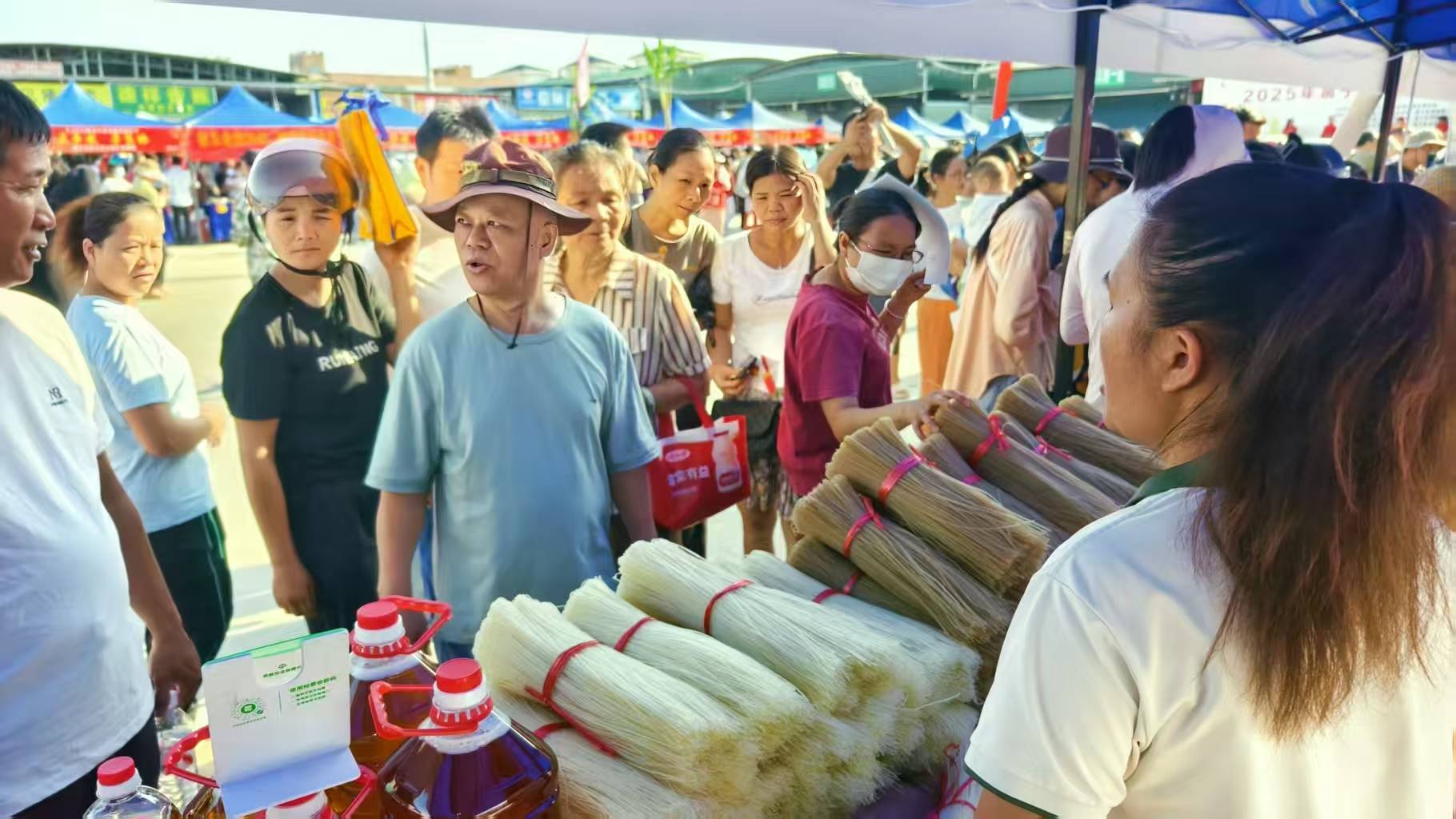 据了解, 邕宁土货市场现场摊位300多个,但了开展庆丰收节活动专门加设60多个展位,商家踊跃报名,展位无空余,展出了百香果、香瓜、香蕉、甘蔗、葡萄、火龙果、香米等多类邕宁特色土货产品,现场有大众成交批量采购甜瓜、钦密百香果、香蕉等特色农产品批发,据不完全统计,活动现场约3万人到场参加活动。丰收节展位区域商家展位货品售罄,部分批发订单预订,当日展位商户销售交易额约为50余万,含预定和合作签约。