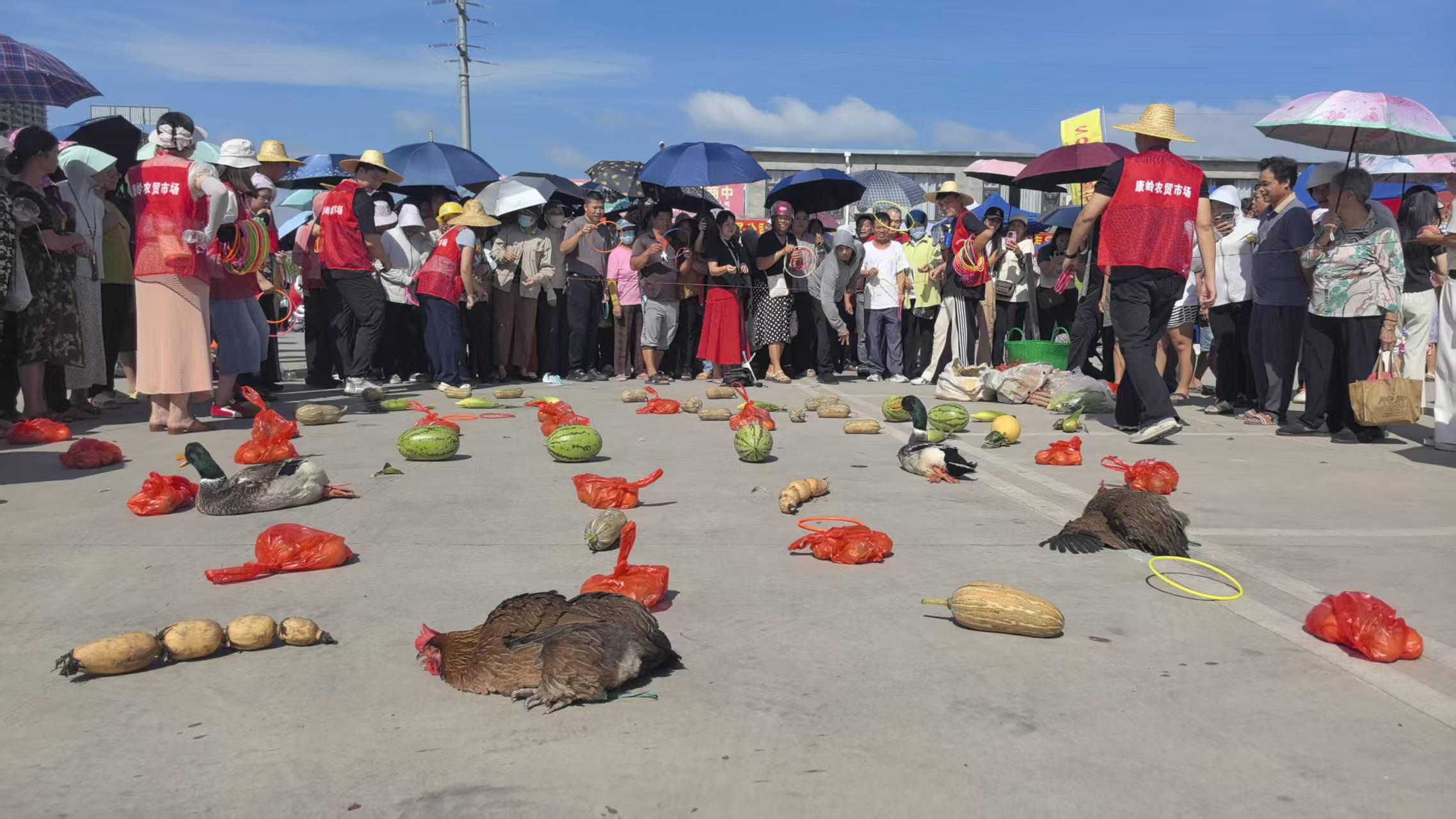 尝过美食再玩游园活动。邕宁土货市场准备了数百样瓜果、活鸡、活鸭当作游园奖品,农民朋友、游客朋友有序排着队参与套圈游园。当大圈抛出手,一位农民套到了一个甜瓜,开心不已。在之后,又有一位农民抛到了一只大肥鸭时,众人欢呼起来,“中了!中了!”手提大肥鸭的农民来自新江镇,他说:“我们种田时经常抛秧,套鸭当然准了!”