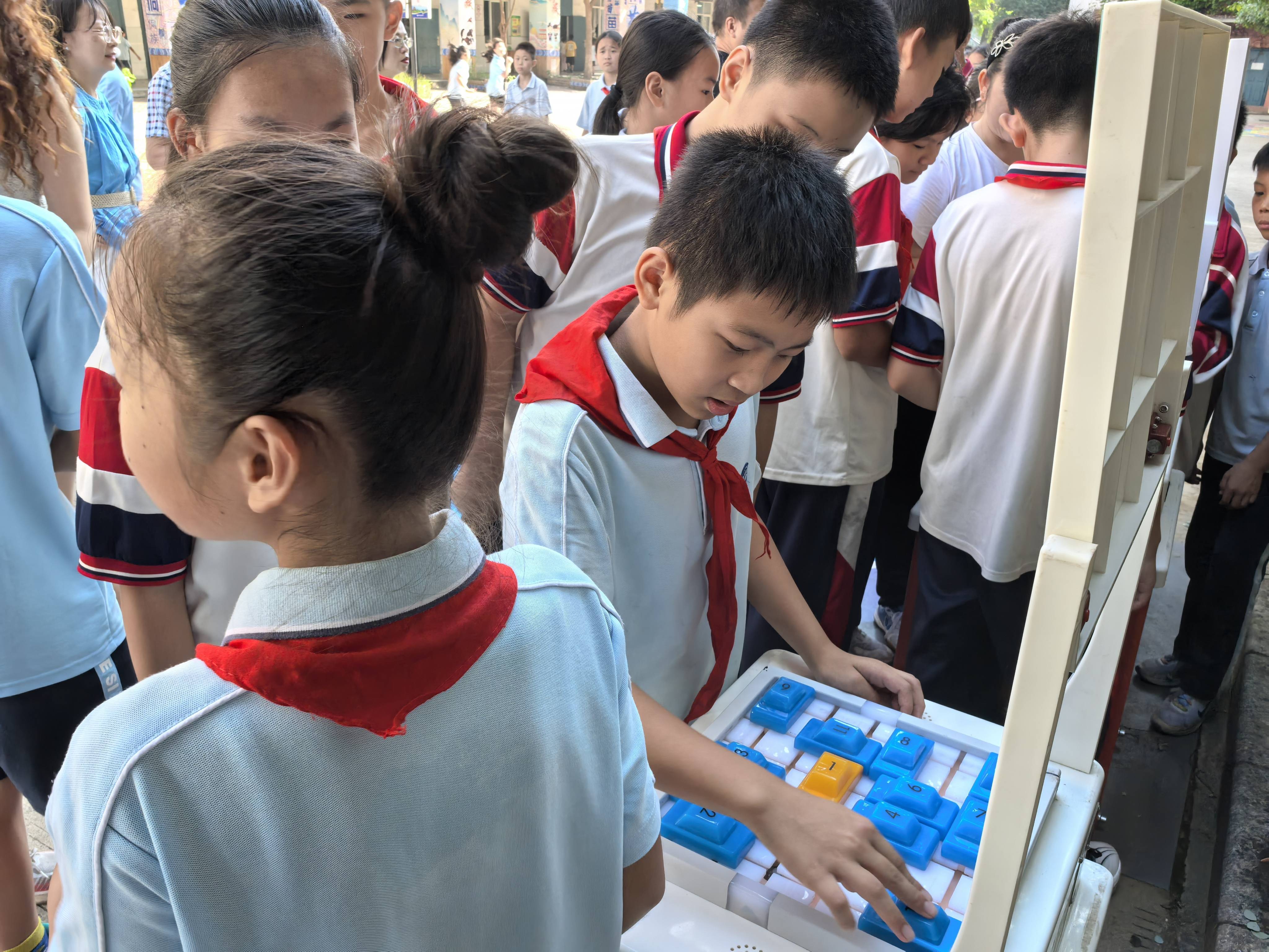 在科学实验表演中,工作人员化身“科学魔法师”,通过空气炮、干冰喷射等生动有趣的实验,将能量转化等抽象原理直观呈现,引来孩子们的阵阵惊叹。在机器狗与机器人互动环节,工作人员耐心引导学生观察,细致解答“机器人如何保持平衡”等问题,点燃了孩子们探索科技的热情。针对不同年级的学生,志愿者们有序组织、维护现场秩序,确保全校学生分批次、有组织地体验各类微型展品,让每一位孩子都能近距离感受科技的魅力。