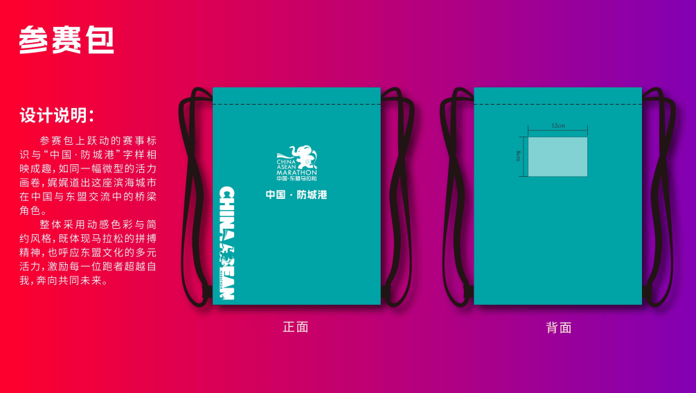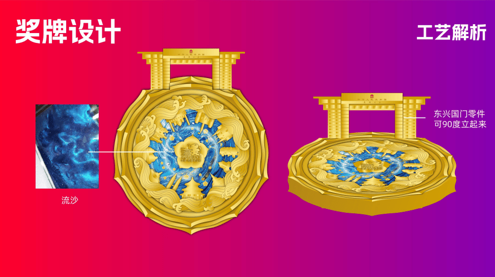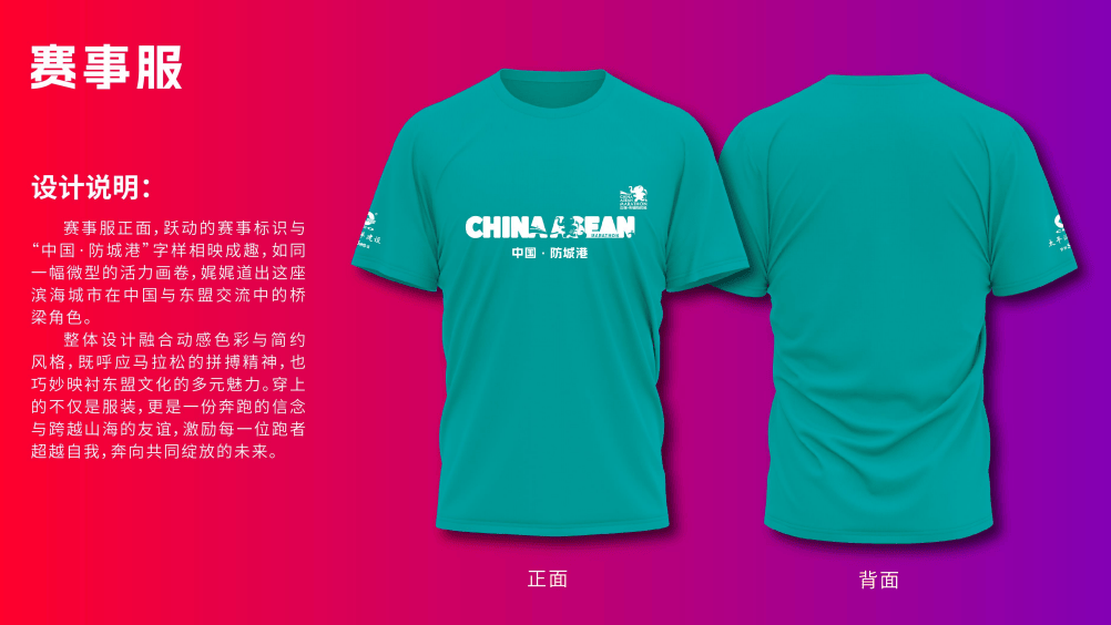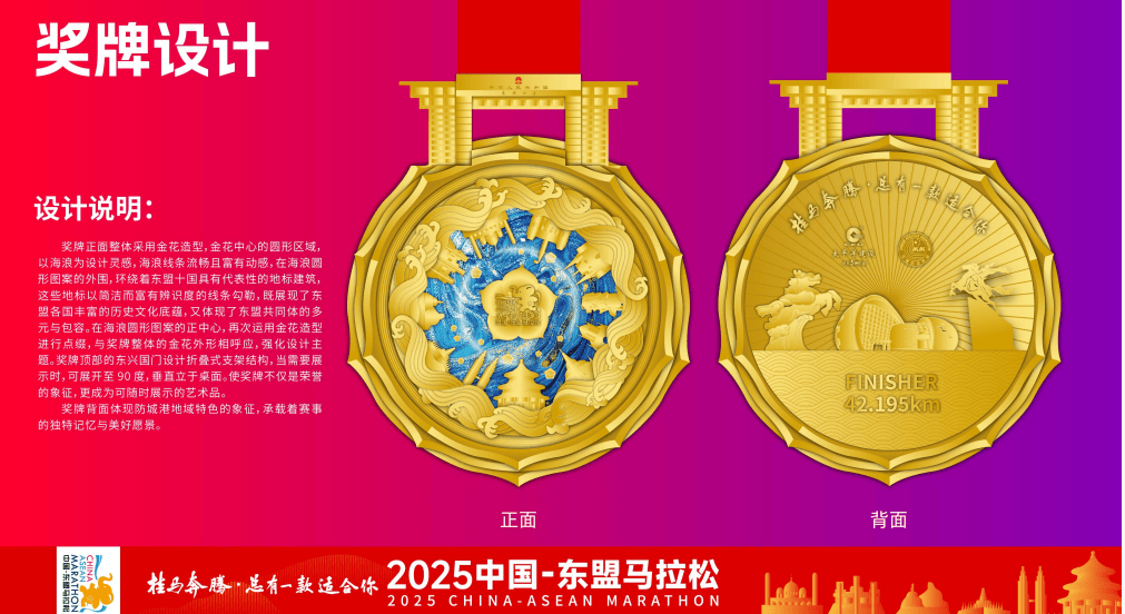 奖牌设计独具匠心,融合国际视野与本土文化:本届赛事视觉形象以红色为主色调,彰显热烈大方,融合防城港城市标识与东盟多元文化,展现“山海相连、口岸通达”的城市意象。赛事奖牌正面以绽放金花为型,中心圆形区域以海浪为灵感,外圈环刻东盟十国代表性建筑,展现多样与包容;奖牌顶部创新设计为“东兴国门”折叠支架,可90度垂直立于桌面,使奖牌兼具荣誉象征与艺术陈列价值;背面融入防城港本地文化符号与山海意象,为跑者珍藏独特记忆。