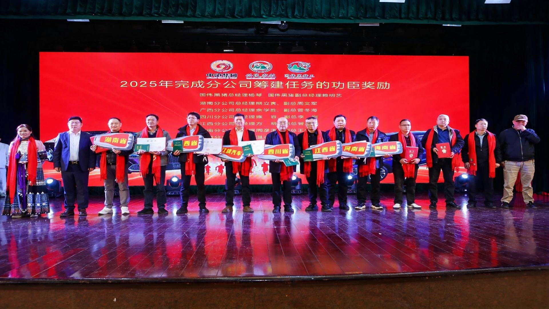 活动现场亮点纷呈:红旗新能源汽车交付全国18省分公司,硬核激励区域市场深耕;“千万工程”技术成果展集中呈现自主研发的中小散户防控非洲猪瘟管理系统、安全生物饲料等创新应用;重庆汇光饲料、广西润港饲料等企业获评“优秀饲料供应商”,广西杨权运输等车队摘得“优秀猪苗运输车队”,彭均尧、杨通莲等56户养殖户分获“先进/优秀养殖户”“优秀种猪场”称号,更有分公司负责人因筹建任务获奔驰、红旗汽车奖励。