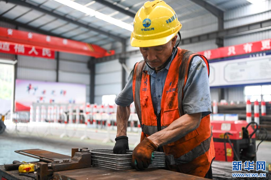 7月1日,在平陆运河马道枢纽建设现场,工人在加工钢筋构件。